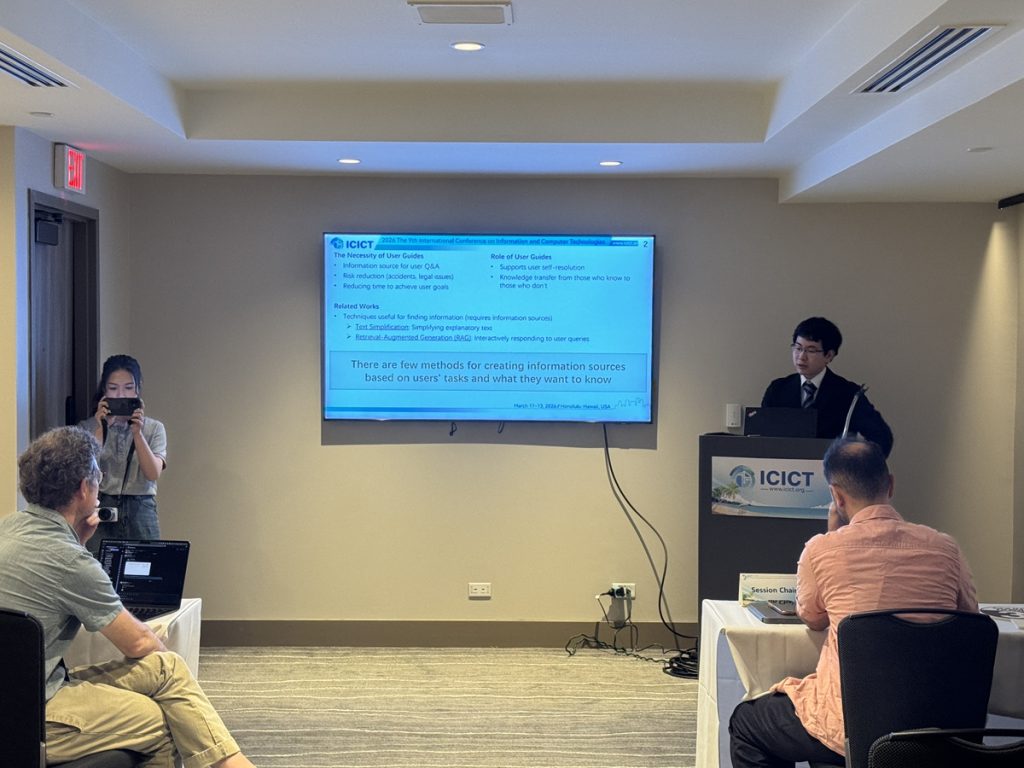 2026年3月11日~13日にホノルル(ハワイ)にて開催された「2026 The 9th International Conference on Information and Computer Technologies (ICICT 2026)」に本研究室より、上前 諒輔さん(修士2年)、鎌田 理久さん(修士2年)、古田 悠華さん(修士2年)が参加し、研究発表を行いました。